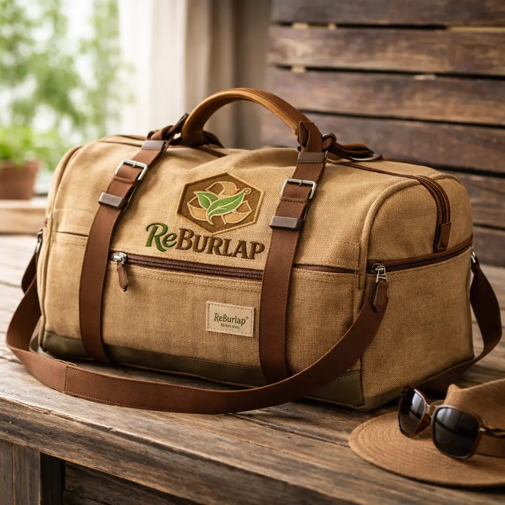 With its natural burlap texture and signature ReBurlap logo, this travel duffel represents sustainable craftsmanship and environmentally conscious living.